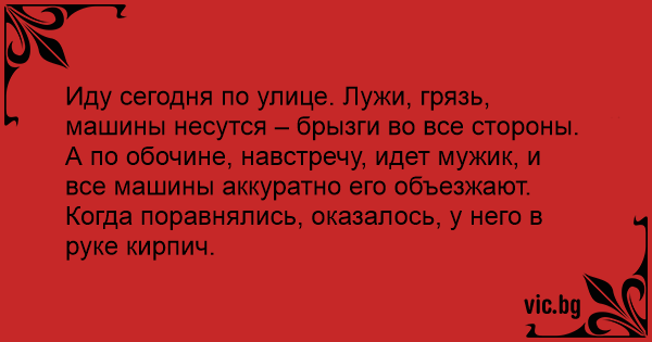 А по обочине, навстречу, идет мужик, и все машины аккуратно его объезжают. Когда поравнялись, оказалось, у него в руке кирпич.