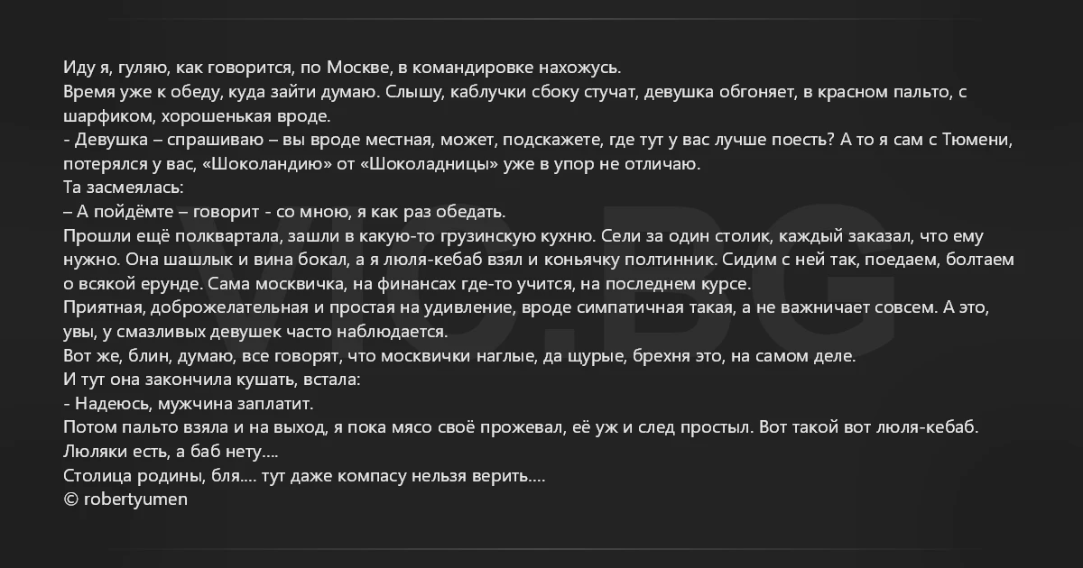 Иду я, гуляю, как говорится, по Москве, в командировке нахожусь. Время уже к обеду, куда зайти думаю. Слышу, каблучки сбоку стучат, девушка обгоняет, в красном пальто, с шарфиком, хорошенькая вроде. - Девушка – спрашиваю – вы вроде местная, может, подскажете, где тут у вас лучше поесть? А то я сам с Тюмени, потерялся у вас, «Шоколандию» от «Шоколадницы» уже в упор не отличаю. Та засмеялась: – А пойдёмте – говорит - со мною, я как раз обедать. Прошли ещё полквартала, зашли в какую-то грузинскую кухню. Сели за один столик, каждый заказал, что ему нужно. Она шашлык и вина бокал, а я люля-кебаб взял и коньячку полтинник. Сидим с ней так, поедаем, болтаем о всякой ерунде. Сама москвичка, на финансах где-то учится, на последнем курсе. Приятная, доброжелательная и простая на удивление, вроде симпатичная такая, а не важничает совсем. А это, увы, у смазливых девушек часто наблюдается. Вот же, блин, думаю, все говорят, что москвички наглые, да щурые, брехня это, на самом деле. И тут она закончила кушать, встала: - Надеюсь, мужчина заплатит. Потом пальто взяла и на выход, я пока мясо своё прожевал, её уж и след простыл. Вот такой вот люля-кебаб. Люляки есть, а баб нету…. Столица родины, бля.… тут даже компасу нельзя верить…. © robertyumen