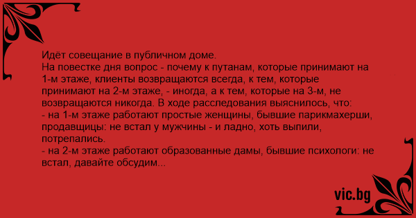На повестке дня вопрос - почему к путанам, которые принимают на 1-м этаже, клиенты возвращаются всегда, к тем, которые принимают на 2-м этаже, - иногда, а к тем, которые на 3-м, не возвращаются никогда. В ходе расследования выяснилось, что: