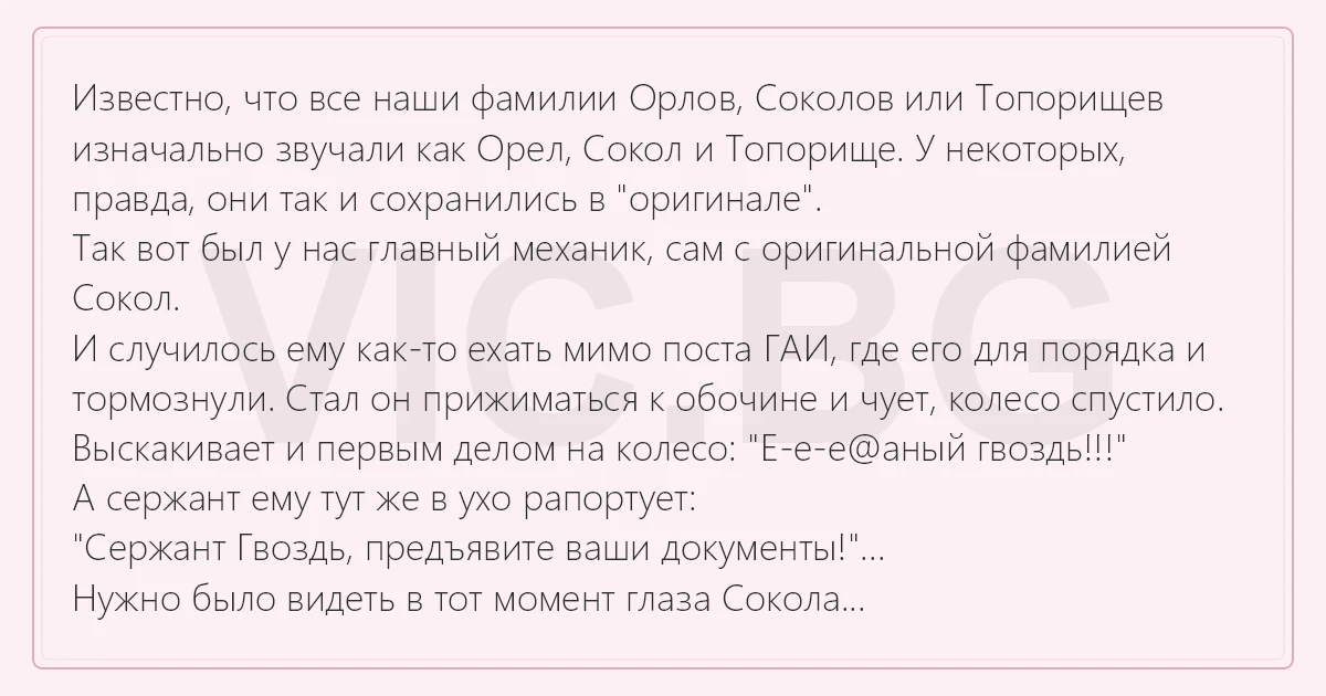 Известно, что все наши фамилии Орлов, Соколов или Топорищев изначально звучали как Орел, Сокол и Топорище. У некоторых, правда, они так и сохранились в "оригинале". Так вот был у нас главный механик, сам с оригинальной фамилией Сокол. И случилось ему как-то ехать мимо поста ГАИ, где его для порядка и тормознули. Стал он прижиматься к обочине и чует, колесо спустило. Выскакивает и первым делом на колесо: "Е-е-е@аный гвоздь!!!" А сержант ему тут же в ухо рапортует: "Сержант Гвоздь, предъявите ваши документы!"... Нужно было видеть в тот момент глаза Сокола...