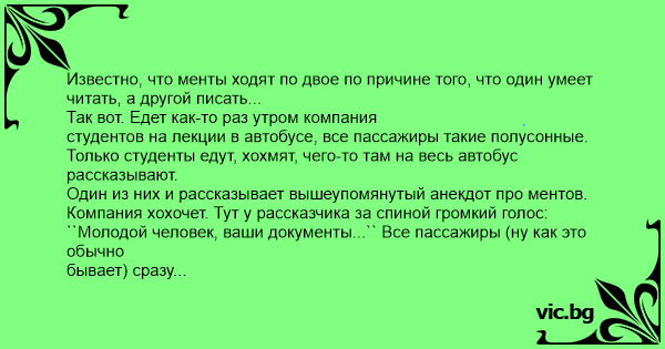 Известно, что менты ходят по двое по причине того, что один умеет читать, а другой писать...