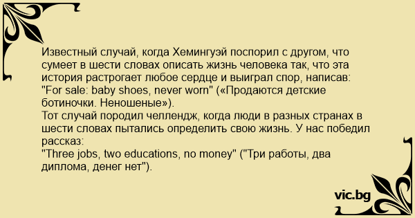 Известный случай, когда Хемингуэй поспорил с другом, что сумеет в шести словах описать жизнь человека так, что эта история растрогает любое сердце и выиграл спор, написав: