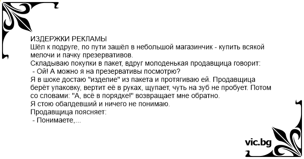 ИЗДЕРЖКИ РЕКЛАМЫ Шёл к подруге, по пути зашёл в небольшой магазинчик - купить всякой мелочи и пачку презервативов.
