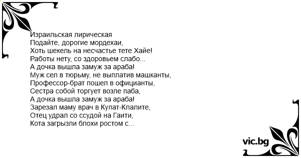 Хоть шекель на несчастье тете Хайе! Работы нету, со здоровьем слабо... А дочка вышла замуж за араба! Муж сел в тюрьму, не выплатив машканты, Профессор-брат пошел в официанты, Сестра собой торгует возле паба, А дочка вышла замуж за араба! Зарезал маму врач в Купат-Клалите, Отец удрал со ссудой на Гаити, Кота загрызли блохи ростом с краба... А дочка вышла замуж за араба! Свекровь лежит, параличом разбита. Племянница свихнулась от иврита. Внук укусил полковника Генштаба... А дочка вышла замуж за араба! Сыночка Мойшу унесло хамсином Жена его облилась керосином И бросилась на скалы с баобаба... А дочка вышла замуж за араба! Давно бы удавилась я - и точка! Но у меня живет с арабом дочка: Орет внучат голодная орава... Подайте теще бедного араба!