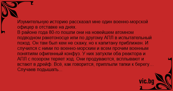 В районе года 80-го пошли они на новейшем атомном подводном ракетоносце или по другому АПЛ в испытательный поход. Он там был кем не скажу, но к капитану приближен. И случился с ними по военно-морским и всем прочим военным понятиям офигенный конфуз. У них затухли оба реактора и АПЛ с позором теряет ход. Они продуваются, всплывают и встают в дрейф. Всё, как говорится, приплыли тапки к берегу…