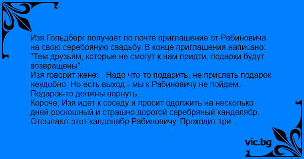Изя Гольдберг получает по почте приглашение от Рабиновича на свою серебряную свадьбу. В конце приглашения написано:
