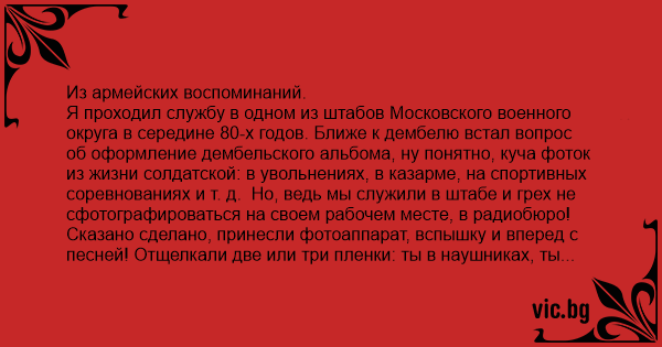 Я проходил службу в одном из штабов Московского военного округа в середине 80-х годов. Ближе к дембелю встал вопрос об оформление дембельского альбома, ну понятно, куча фоток из жизни солдатской: в увольнениях, в казарме, на спортивных соревнованиях и т. д. Но, ведь мы служили в штабе и грех не сфотографироваться на своем рабочем месте, в радиобюро! Сказано сделано, принесли фотоаппарат, вспышку и вперед с песней! Отщелкали две или три пленки: ты в наушниках, ты за радиоприемником, ты работаешь на ключе. В общем, мечта шпиона! Отослали молодого бойца в казарму, чтобы за ночь проявить пленку и утром притаранить ее в штаб.