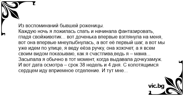 Каждую ночь я ложилась спать и начинала фантазировать, гладя свойживотик... вот доченька впервые взглянула на меня, вот она впервые мнеулыбнулась, а вот её первый шаг, а вот мы уже идем по улице, я веду еёза ручку, она хохочет, а я всем своим видом показываю, как я счастлива,ведь я – мама... Засыпала я обычно в тот момент, когда выдавала дочкузамуж.