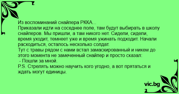 Из воспоминаний снайпера РККА... Приказали идти на соседнее поле, там будут выбирать в школу снайперов. Мы пришли, а там никого нет. Сидели, сидели, время уходит, темнеет уже и время ужинать подходит. Начали расходиться, осталось несколько солдат. Тут с травы рядом с нами встал замаскированный и никем до этого момента не замеченный снайпер и просто сказал: - Пошли за мной. P.S. Стрелять можно научить кого угодно, а вот прятаться и ждать могут единицы.