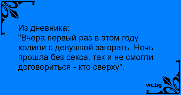 Из дневника:<br />"Вчера первый раз в этом году ходили с девушкой загорать. Ночь прошла без cekca, так и не смогли договориться - кто сверху".