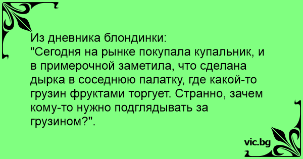 "Сегодня на рынке покупала купальник, и в примерочной заметила, что сделана дырка в соседнюю палатку, где какой-то грузин фруктами торгует. Странно, зачем кому-то нужно подглядывать за грузином?".