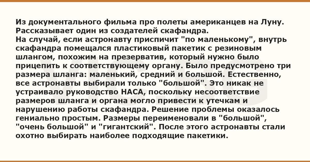 На случай, если астронавту приспичит "по маленькому", внутрь скафандра помещался пластиковый пакетик с резиновым шлангом, похожим на пpeзepbatиb, который нужно было прицепить к соответствующему органу. Было предусмотрено три размера шланга: маленький, средний и большой. Естественно, все астронавты выбирали только "большой". Это никак не устраивало руководство НАСА, поскольку несоответствие размеров шланга и органа могло привести к утечкам и нарушению работы скафандра. Решение проблемы оказалось гениально простым. Размеры переименовали в "большой", "очень большой" и "гигантский". После этого астронавты стали охотно выбирать наиболее подходящие пакетики.