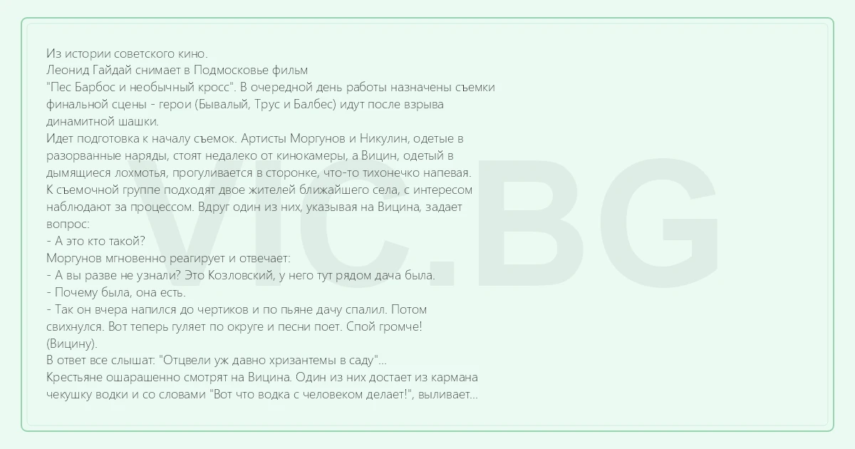 Из истории советского кино. Леонид Гайдай снимает в Подмосковье фильм "Пес Барбос и необычный кросс". В очередной день работы назначены съемки финальной сцены - герои (Бывалый, Трус и Балбес) идут после взрыва динамитной шашки. Идет подготовка к началу съемок. Артисты Моргунов и Никулин, одетые в разорванные наряды, стоят недалеко от кинокамеры, а Вицин, одетый в дымящиеся лохмотья, прогуливается в сторонке, что-то тихонечко напевая. К съемочной группе подходят двое жителей ближайшего села, с интересом наблюдают за процессом. Вдруг один из них, указывая на Вицина, задает вопрос: - А это кто такой? Моргунов мгновенно реагирует и отвечает: - А вы разве не узнали? Это Козловский, у него тут рядом дача была. - Почему была, она есть. - Так он вчера напился до чертиков и по пьяне дачу спалил. Потом свихнулся. Вот теперь гуляет по округе и песни поет. Спой громче! (Вицину). В ответ все слышат: "Отцвели уж давно хризантемы в саду"... Крестьяне ошарашенно смотрят на Вицина. Один из них достает из кармана чекушку водки и со словами "Вот что водка с человеком делает!", выливает водку на землю. Колхозники молча уходят.