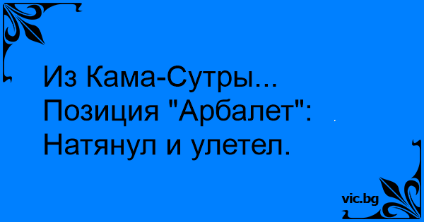 Из Кама-Сутры... Позиция "Арбалет": Натянул и улетел.