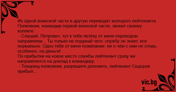 Лейтенант с огорчённым видом отдал полковнику 500 рублей и ушёл обустраиваться на новом месте.
