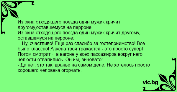 - Ну, счастливо! Еще раз спасибо за гостеприимство! Все было классно! А жена твоя трахается - это просто супер! Потом смотрит - в вагоне у всех пассажиров вокруг него челюсти отвалились. Он им, виновато: