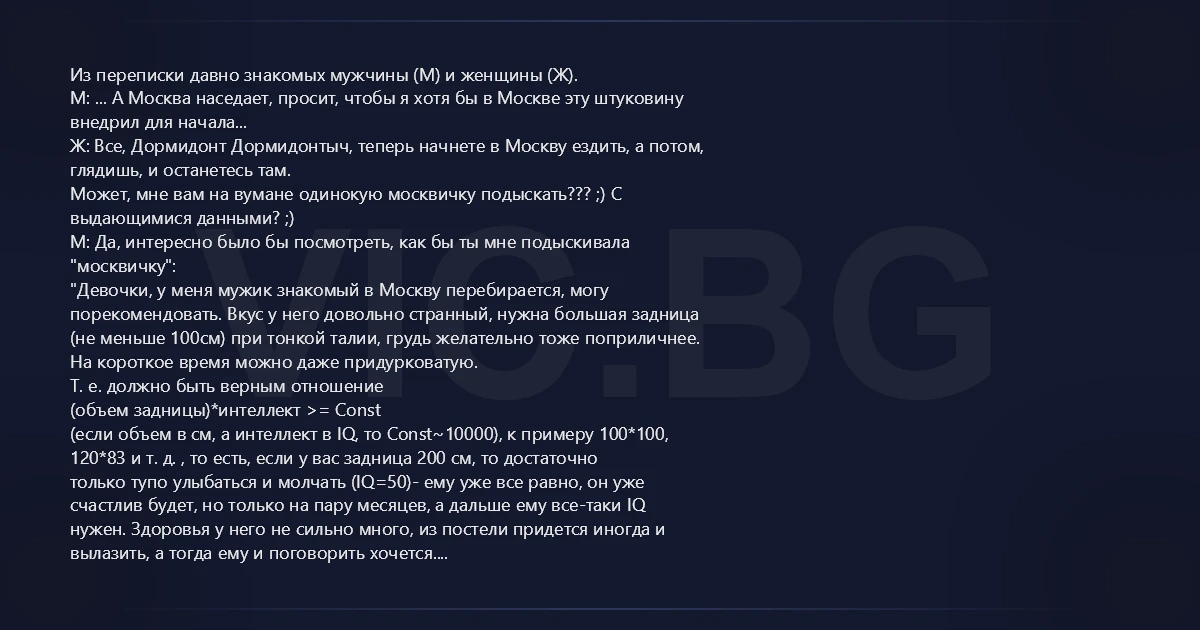 Из переписки давно знакомых мужчины (М) и женщины (Ж). М: ... А Москва наседает, просит, чтобы я хотя бы в Москве эту штуковину внедрил для начала... Ж: Все, Дормидонт Дормидонтыч, теперь начнете в Москву ездить, а потом, глядишь, и останетесь там. Может, мне вам на вумане одинокую москвичку подыскать??? ;) С выдающимися данными? ;) М: Да, интересно было бы посмотреть, как бы ты мне подыскивала "москвичку": "Девочки, у меня мужик знакомый в Москву перебирается, могу порекомендовать. Вкус у него довольно странный, нужна большая задница (не меньше 100см) при тонкой талии, грудь желательно тоже поприличнее. На короткое время можно даже придурковатую. Т. е. должно быть верным отношение (объем задницы)*интеллект >= Const (если объем в см, а интеллект в IQ, то Const~10000), к примеру 100*100, 120*83 и т. д. , то есть, если у вас задница 200 см, то достаточно только тупо улыбаться и молчать (IQ=50)- ему уже все равно, он уже счастлив будет, но только на пару месяцев, а дальше ему все-таки IQ нужен. Здоровья у него не сильно много, из постели придется иногда и вылазить, а тогда ему и поговорить хочется. Как мужик так себе, довольно занудливый (что поделать, старенький уже), но довольно ласковый и, главное, девочки, перегаром никогда не пахнет! Да и поприкалываться можно, с чувством юмора. При случае поможет по хозяйству, руками умеет многое ;), однако сильно много на него не нагрузишь (староват), но по электрике там или по сложной технике всяко поможет. Практичен в хозяйстве, ест вааще мало и без претензий: кашку ему там с утра, на обеде сам пожрет, а вечером он худеет (тоже, кстати, тема для общения, но учтите - он вас начнет наоборот пытаться откармливать, чтобы ваш IQ терпеть). В остальное время будет тихо лежать в уголке с книжкой или у компа сидеть, иногда нужно отпускать на рыбалку - это святое, если друзей в Москве найдет. Иногда будет поскуливать - проситься попить пивка и в баньку. Да, живность любит, так что ваших Барсиков и Мосечек будет любить и, если нужно, даже собачку с удовольствием выгуляет. Так что, девочки с большими задницами, пишите, с удовольствием передам в хорошие руки, а то нарвется на стерву какую-нибудь, и мне его жалко будет - все-таки давно его знаю."