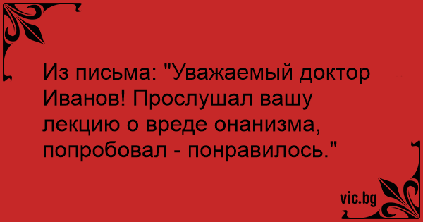 Из письма: "Уважаемый доктор Иванов! Прослушал вашу лекцию о вреде онанизма, попробовал - понравилось."