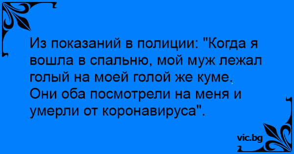 Из показаний в полиции: "Когда я вошла в спальню, мой муж лежал голый на моей голой же куме. Они оба посмотрели на меня и умерли от коронавируса".