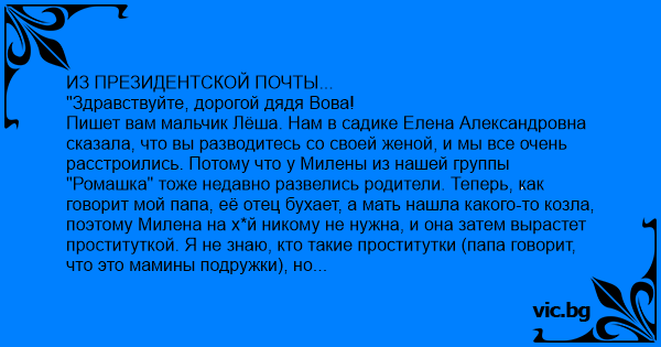 Пишет вам мальчик Лёша. Нам в садике Елена Александровна сказала, что вы разводитесь со своей женой, и мы все очень расстроились. Потому что у Милены из нашей группы "Ромашка" тоже недавно развелись родители. Теперь, как говорит мой папа, её отец бухает, а мать нашла какого-то козла, поэтому Милена на хуй никому не нужна, и она затем вырастет проституткой. Я не знаю, кто такие пpoctиtуtkи (папа говорит, что это мамины подружки), но я не хочу, чтобы Милана стала проституткой.