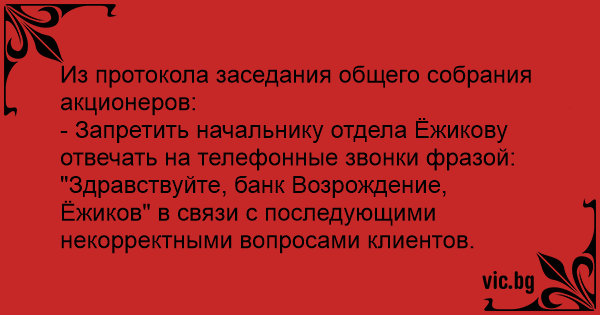 - Запретить начальнику отдела Ёжикову отвечать на телефонные звонки фразой: "Здравствуйте, банк Возрождение, Ёжиков" в связи с последующими некорректными вопросами клиентов.