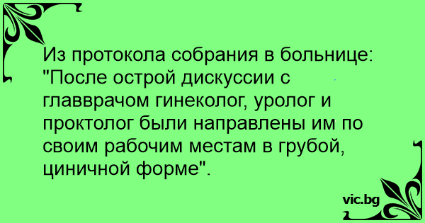 Нашия главен лекар е истински грубиян, всяка сутрин след сутрешната консултация изпраща гинеколога, уролога и проктолога по работните им места
