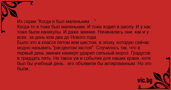 Было это в классе пятом или шестом, в эпоху, которую сейчас модно называть "расцветом застоя". Случилось так, что в первый день зимних каникул ударил сильный мороз. Градусов в тридцать пять. Не такое уж и событие для наших краев, хотя был бы учебный день - его объявили бы актированным. Но это были уже каникулы, и актированным этот день быть никак не мог, а в школу идти было нужно, так как по тогдашней традиции в первый день зимних каникул производилась генеральная уборка класса с последующей выдачей дневников. Одели меня родители "по фактической погоде" и отправили в школу. "Кворума" для генеральной уборки, естественно, не набралось, поэтому получил я свой дневник и отправился в обратный путь.