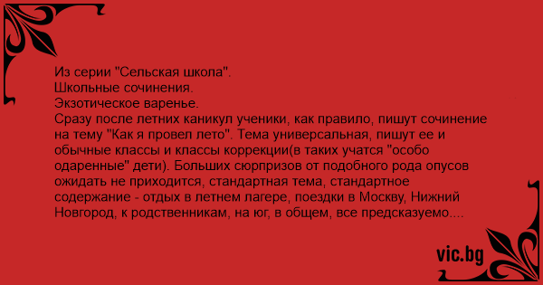 Сразу после летних каникул ученики, как правило, пишут сочинение на тему "Как я провел лето". Тема универсальная, пишут ее и обычные классы и классы коррекции(в таких учатся "особо одаренные" дети). Больших сюрпризов от подобного рода опусов ожидать не приходится, стандартная тема, стандартное содержание - отдых в летнем лагере, поездки в Москву, Нижний Новгород, к родственникам, на юг, в общем, все предсказуемо.