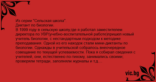 В 1999 году в сельскую школу,где я работал заместителем директора по УВР(учебно-воспитательной работе)пришел новый учитель биологии, с нестандартным подходом к методике преподавания. Одной из его находок стали мини-диктанты по биологии. Однажды в учительской собралось внеочередное совещание по текущей успеваемости. Пока я собирал сведения с учителей, они, естественно по-тихому, занимались своими; проверяли тетради, заполняли журналы и т.д. Вдруг среди этого спокойного времяпровождения раздался громкий, надрывный смех, преходящий в настоящую истерику - это пробрало молодого специалиста-биолога. Первая мысль - сдали нервы, не выдержал работы с "одаренными" детьми, пора вызывать психиатрическую помощь. Когда коллега немного успокоился, мы постарались выяснить, что случилось. Итак, рассказ учителя биологии: "Сижу спокойно на совещании, спрятался за спинами учителей, проверяю мини-диктанты по биологии, работы "слабые", и вдруг - "перл". Одна из учениц - не самых лучших, отожгла(далее с сохранением авторского стиля, пунктуации и орфографии): "Вопрос 1. Каркодил - он как яшперица, только большая. У нево есть чехуя. Каркодил свои яйца зарывает в писок, потомушто если он спит ими на ружу, они портются. Вопрос 2. Лисы ходют па адиночке, и лишь иногда парами, когда им нужно заесть молодого тюленя заползшего в лес". Дикий хохот, совещание практически сорвано, еле-еле успокаиваю развеселившихся учителей. Вдруг в относительной тишине раздается вопрос учителя английского языка: "Я не понял, а зачем тюлень в лес заполз?". На этом совещание закончилось.