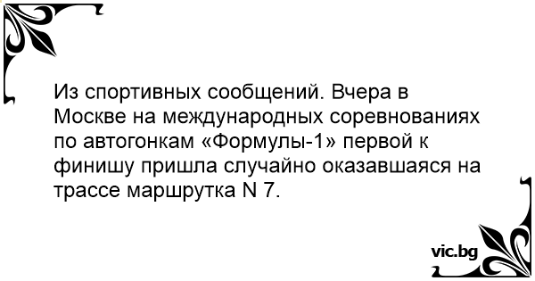 Из спортивных сообщений. Вчера в Москве на международных соревнованиях по автогонкам «Формулы-1» первой к финишу пришла случайно оказавшаяся на трассе маршрутка N 7.