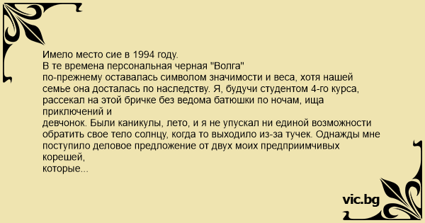Имело место сие в 1994 году. В те времена персональная черная "Волга" по-прежнему оставалась символом значимости и веса, хотя нашей семье она досталась по наследству. Я, будучи студентом 4-го курса, рассекал на этой бричке без ведома батюшки по ночам, ища приключений и девчонок. Были каникулы, лето, и я не упускал ни единой возможности обратить свое тело солнцу, когда то выходило из-за тучек. Однажды мне поступило деловое предложение от двух моих предприимчивых корешей, которые посулили мне 10.000 рублей (ни ?уя себе!!!! 1994 год, все-таки) за поездку на этой, тогда еще престижной батиной тачиле, в аэропорт и обратно для встречи какого-то важного, для них, американца. Мне до него дела особенно не было, и я, в отличии от друзей (один из них-переводчик, другой - собственно встречающий), оделся весьма по-пляжному, в надежде хоть чуть-чуть позагорать. Приехав на сверкающем черным лаком ГАЗе-24 в аэропорт, я, весьма удовлетворенный сообщением об опоздании рейса на 40 минут, растянулся на лавочке под палящим солнцем и благополучно заснул, свесив ноги с этой скамейки (это ОЧЕНЬ важно!!!!!)...... Сквозь дрему я наконец расслышал обрывки диалога на английском: "...в том-то направлении - город, ... это машина, на которой мы поедем, ....а это наш водитель Алекс". Ну вот, думаю, и "подъем". Ага, тут же мне: "Саша, вставай, поехали." Прогнал остатки сна, собрался с силами и, сделав весьма энергичный "подъем", эффектно и с грохотом встал на колени, рядом со скамейкой - ножки-то ОТЛЕЖАЛ, пока загорал!!! Ребятам: "Пацаны, помогите встать - ноги отсидел." Они, бросив чемоданы этого янки, бросились ко мне, подняли и потащили к машине, как последнего паралитика, с заплетающимися ногами (хорошо, хоть на лицо - не даун), в одежде последнего нигера из Гарлема. У этого америкоса - рот открылся, а в голове, видимо, фраза:"... а это наш водитель Алекс".. Долго еще, пока ехали, я наблюдал в заднее зеркало, как он, не отводя глаз, смотрит за хаотическими движениями моих ножек, полных "Боржоми", по педалям. Когда приехали, он сказал единственное: "Мне казалось что я играю в автогонки, но в отличие от компьютера, здесь нельзя было бы сохраниться". И подарил каждому по доллару, на мое лечение, наверное.