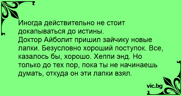 Доктор Айболит пришил зайчику новые лапки. Безусловно хороший поступок. Все, казалось бы, хорошо. Хеппи энд. Но только до тех пор, пока ты не начинаешь думать, откуда он эти лапки взял.