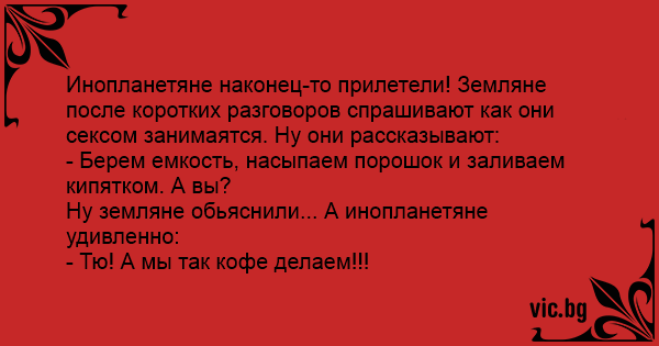 Инопланетяне наконец-то прилетели! Земляне после коротких разговоров спрашивают как они сексом занимаятся. Ну они рассказывают: