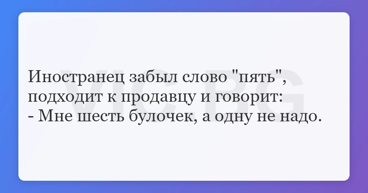 Иностранец забыл слово "пять", подходит к продавцу и говорит:- Мне шесть булочек, а одну не надо. 20 0 0 Анекдоты