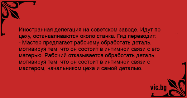 - Мастер предлагает рабочему обработать деталь, мотивируя тем, что он состоит в интимной связи с его матерью. Рабочий отказывается обработать деталь, мотивируя тем, что он состоит в интимной связи с мастером, начальником цеха и самой деталью.