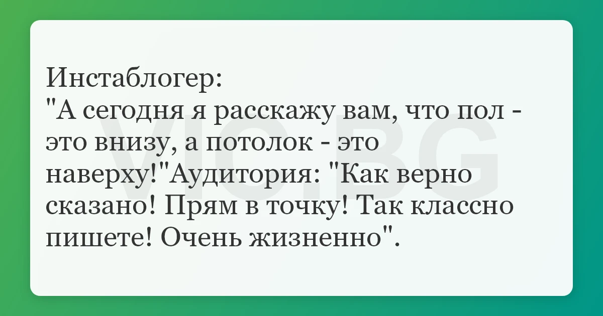 Инстаблогер: "А сегодня я расскажу вам, что пол - это внизу, а потолок - это наверху!"Аудитория: "Как верно сказано! Прям в точку! Так классно пишете! Очень жизненно".