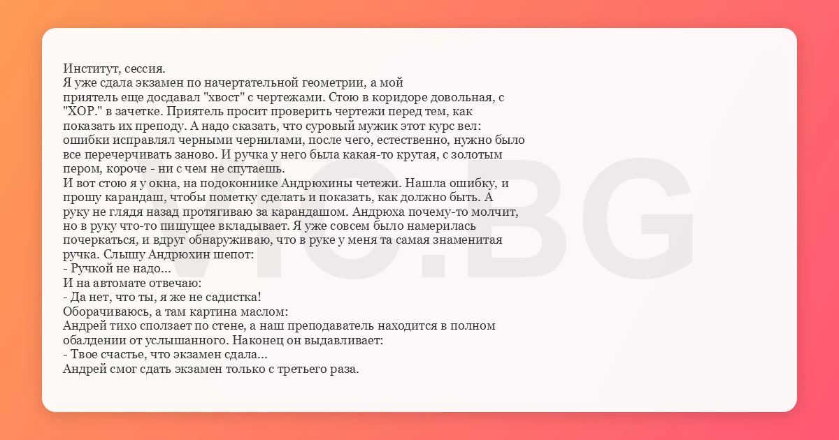 Институт, сессия. Я уже сдала экзамен по начертательной геометрии, а мой приятель еще досдавал "хвост" с чертежами. Стою в коридоре довольная, с "ХОР." в зачетке. Приятель просит проверить чертежи перед тем, как показать их преподу. А надо сказать, что суровый мужик этот курс вел: ошибки исправлял черными чернилами, после чего, естественно, нужно было все перечерчивать заново. И ручка у него была какая-то крутая, с золотым пером, короче - ни с чем не спутаешь. И вот стою я у окна, на подоконнике Андрюхины четежи. Нашла ошибку, и прошу карандаш, чтобы пометку сделать и показать, как должно быть. А руку не глядя назад протягиваю за карандашом. Андрюха почему-то молчит, но в руку что-то пишущее вкладывает. Я уже совсем было намерилась почеркаться, и вдруг обнаруживаю, что в руке у меня та самая знаменитая ручка. Слышу Андрюхин шепот: - Ручкой не надо... И на автомате отвечаю: - Да нет, что ты, я же не садистка! Оборачиваюсь, а там картина маслом: Андрей тихо сползает по стене, а наш преподаватель находится в полном обалдении от услышанного. Наконец он выдавливает: - Твое счастье, что экзамен сдала... Андрей смог сдать экзамен только с третьего раза.
