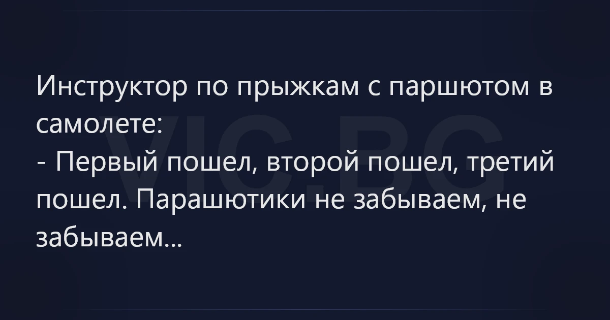 Инструктор по прыжкам с паршютом в самолете: - Первый пошел, второй пошел, третий пошел. Парашютики не забываем, не забываем...