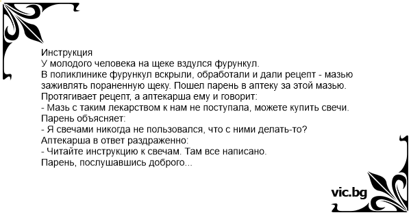 У молодого человека на щеке вздулся фурункул. В поликлинике фурункул вскрыли, обработали и дали рецепт - мазью заживлять пораненную щеку. Пошел парень в аптеку за этой мазью. Протягивает рецепт, а аптекарша ему и говорит: - Мазь с таким лекарством к нам не поступала, можете купить свечи. Парень объясняет: - Я свечами никогда не пользовался, что с ними делать-то? Аптекарша в ответ раздраженно: - Читайте инструкцию к свечам. Там все написано. Парень, послушавшись доброго совета, разворачивает инструкцию, читает вслух: "Освободить свечу от оболочки, чистыми руками ввести в задний проход и продвинуть до больного места". Задумчиво почесав затылок, парень произнес: - Девушка, я так далеко не продвину!