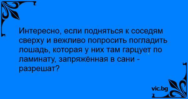 Интересно, если подняться к соседям сверху и вежливо попросить погладить лошадь, которая у них там гарцует по ламинату, запряжённая в сани - разрешат?