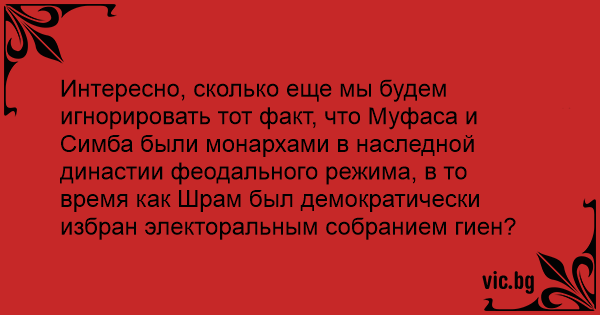 Интересно, сколько еще мы будем игнорировать тот факт, что Муфаса и Симба были монархами в наследной династии феодального режима, в то время как Шрам был демократически избран электоральным собранием гиен?