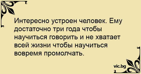 Интересно устроен человек. Ему достаточно три года чтобы научиться говорить и не хватает всей жизни чтобы научиться вовремя промолчать.