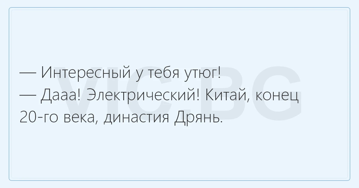 — Интересный у тебя утюг! — Дааа! Электрический! Китай, конец 20-го века, династия Дрянь.