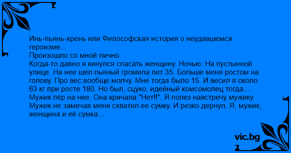 Инь-пьянь-хрень или Философская история о неудавшемся героизме... Произошло со мной лично. Когда-то давно я кинулся спасать женщину. Ночью. На пустынной улице. На нее шел пьяный громила лет 35. Больше меня ростом на голову. Про вес вообще молчу. Мне тогда было 15. И весил я около 63 кг при росте 180. Но был, сцуко, идейный комсомолец тогда... Мужик пёр на нее. Она кричала "Нет!!". Я полез навстречу мужику. Мужик не замечая меня схватил ее сумку. И резко дернул. Я, мужик, женщина и её сумка оказались на асфальте. Женщина еще громче заорала "Нет!!!" Но уже с какой-то другой интонацией. Мужик отпустил сумку. Женщина полезла в нее и вытащила оттуда разбившуюся бутылку водки. После этого они обнялись и плача пошли куда-то. А я много думал... P.S. Случай реальный. Больше как-то не доводилось мне соваться не в свое дело.