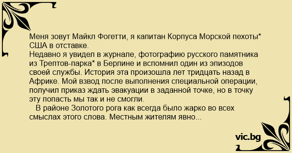 Недавно я увидел в журнале, фотографию русского памятника из Трептов-парка* в Берлине и вспомнил один из эпизодов своей службы. История эта произошла лет тридцать назад в Африке. Мой взвод после выполнения специальной операции, получил приказ ждать эвакуации в заданной точке, но в точку эту попасть мы так и не смогли.