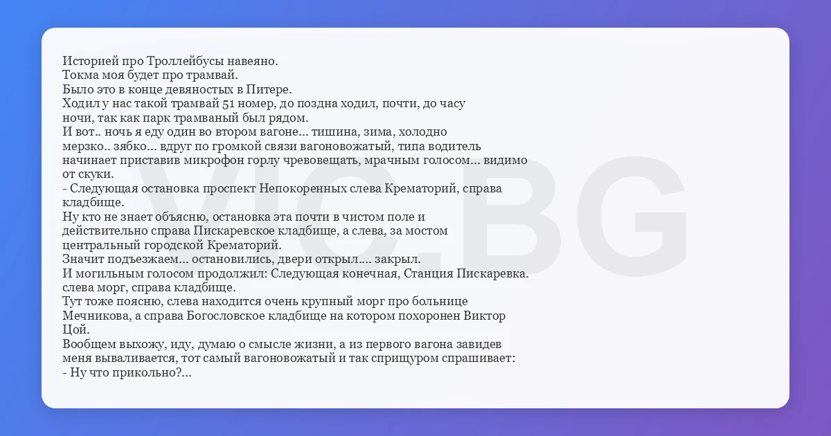 Историей про Троллейбусы навеяно. Токма моя будет про трамвай. Было это в конце девяностых в Питере. Ходил у нас такой трамвай 51 номер, до поздна ходил, почти, до часу ночи, так как парк трамваный был рядом. И вот.. ночь я еду один во втором вагоне... тишина, зима, холодно мерзко.. зябко... вдруг по громкой связи вагоновожатый, типа водитель начинает приставив микрофон горлу чревовещать, мрачным голосом... видимо от скуки. - Следующая остановка проспект Непокоренных слева Крематорий, справа кладбище. Ну кто не знает объясню, остановка эта почти в чистом поле и действительно справа Пискаревское кладбище, а слева, за мостом центральный городской Крематорий. Значит подъезжаем... остановились, двери открыл.... закрыл. И могильным голосом продолжил: Следующая конечная, Станция Пискаревка. слева морг, справа кладбище. Тут тоже поясню, слева находится очень крупный морг про больнице Мечникова, а справа Богословское кладбище на котором похоронен Виктор Цой. Вообщем выхожу, иду, думаю о смысле жизни, а из первого вагона завидев меня вываливается, тот самый вагоновожатый и так сприщуром спрашивает: - Ну что прикольно? Я отвечаю: - Блин, первый раз задумался где живу! А он в ответ: - Во-во, а я вот кажный божий день о смысле жизни размышляю! И заржал...... ===== p/s/ Вот видать за это нас Питерских Философов-Интеллегентов на Руси и уважажают однако, юморок у нас на болотах нихрена не Одесский!