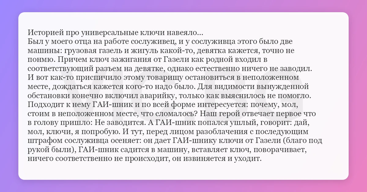 Историей про универсальные ключи навеяло... Был у моего отца на работе сослуживец, и у сослуживца этого было две машины: грузовая газель и жигуль какой-то, девятка кажется, точно не понмю. Причем ключ зажигания от Газели как родной входил в соответствующий разъем на девятке, однако естественно ничего не заводил. И вот как-то приспичило этому товарищу остановиться в неположенном месте, дождаться кажется кого-то надо было. Для видимости вынужденной обстановки конечно включил аварийку, только как выяснилось не помогло. Подходит к нему ГАИ-шник и по всей форме интересуется: почему, мол, стоим в неположенном месте, что сломалось? Наш герой отвечает первое что в голову пришло: Не заводится. А ГАИ-шник попался ушлый, говорит: дай, мол, ключи, я попробую. И тут, перед лицом разоблачения с последующим штрафом сослуживца осеняет: он дает ГАИ-шнику ключи от Газели (благо под рукой были), ГАИ-шник садится в машину, вставляет ключ, поворачивает, ничего соответственно не происходит, он извиняется и уходит.