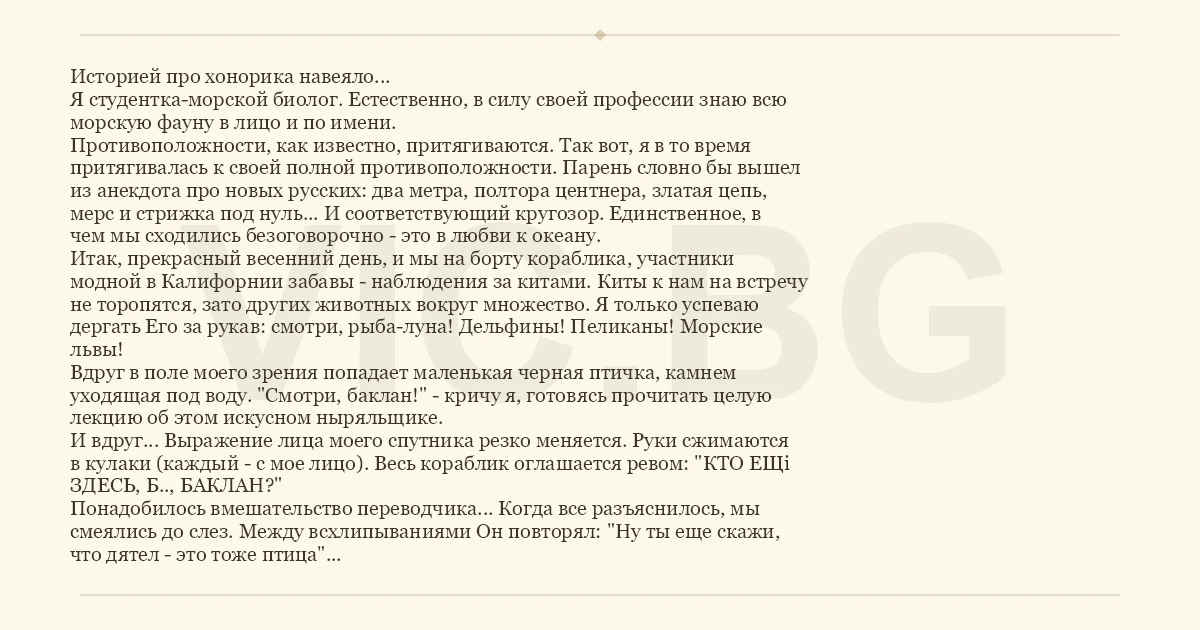 Историей про хонорика навеяло... Я студентка-морской биолог. Естественно, в силу своей профессии знаю всю морскую фауну в лицо и по имени. Противоположности, как известно, притягиваются. Так вот, я в то время притягивалась к своей полной противоположности. Парень словно бы вышел из анекдота про новых русских: два метра, полтора центнера, златая цепь, мерс и стрижка под нуль... И соответствующий кругозор. Единственное, в чем мы сходились безоговорочно - это в любви к океану. Итак, прекрасный весенний день, и мы на борту кораблика, участники модной в Калифорнии забавы - наблюдения за китами. Киты к нам на встречу не торопятся, зато других животных вокруг множество. Я только успеваю дергать Его за рукав: смотри, рыба-луна! Дельфины! Пеликаны! Морские львы! Вдруг в поле моего зрения попадает маленькая черная птичка, камнем уходящая под воду. "Смотри, баклан!" - кричу я, готовясь прочитать целую лекцию об этом искусном ныряльщике. И вдруг... Выражение лица моего спутника резко меняется. Руки сжимаются в кулаки (каждый - с мое лицо). Весь кораблик оглашается ревом: "КТО ЕЩі ЗДЕСЬ, Б.., БАКЛАН?" Понадобилось вмешательство переводчика... Когда все разъяснилось, мы смеялись до слез. Между всхлипываниями Он повторял: "Ну ты еще скажи, что дятел - это тоже птица"...