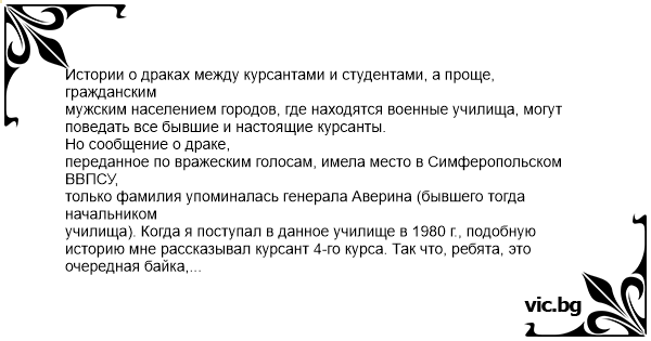 Истории о драках между курсантами и студентами, а проще, гражданским мужским населением городов, где находятся военные училища, могут поведать все бывшие и настоящие курсанты. Но сообщение о драке, переданноe по вражеским голосам, имела место в Симферопольском ВВПСУ, только фамилия упоминалась генерала Аверина (бывшего тогда начальником училища). Когда я поступал в данное училище в 1980 г., подобную историю мне рассказывал курсант 4-го курса. Так что, ребята, это очередная байка, гуляющая по всем училищам страны. А теперь история из жизни СВВПСУ. Году в 1983-м несколько курсантов получили по сопатке на городской дискотеке, расположенной в парке им. Шевченко, возле самого училища. Размазав кровь и сопли, они не побежали звать на помощь своих однокашников, а сделали все строго в соответствии с марксистско-ленинским учением о войне и армии, а также применив знания, полученные на кафедре тактики. В день следующих танцев, две роты с флажками (типа культпоход в город) вышли за ворота. Одна рота засела в кустах вокруг дискотеки, другая вошла в ограду танцплощадки и начала жестоко мстить. Бедные парни, вырвавшиеся из бойни, выскакивали за помощью, но тут попадали во второе кольцо нападавших и месть ужесточалась. Когда на место побоища стянулись силы правопорядка, было уже тихо и бесследно. Все училище построили на плацу, чтобы выслушать проповедь начальника училища, генерала-майора Гудимова (мир его праху). Самое удивительное было то, что закончив разнос своих подчиненных, он отвернулся от микрофона, но не рассчитал мощности своего голоса, и все училище услышало окончание его речи: "Ну и правильно сделали". Стало ясно, что последствий особых не будет, генерала мы зауважали еще сильнее, нападения на личный состав прекратились.