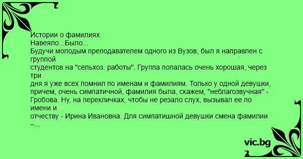Истории о фамилиях. Навеяло...Было... Будучи молодым преподавателем одного из Вузов, был я направлен с группой студентов на "сельхоз. работы". Группа попалась очень хорошая, через три дня я уже всех помнил по именам и фамилиям. Только у одной девушки, причем, очень симпатичной, фамилия была, скажем, "неблагозвучная" - Гробова. Ну, на перекличках, чтобы не резало слух, вызывал ее по имени и отчеству - Ирина Ивановна. Для симпатишной девушки смена фамилии – дело не сложное. "Колхоз" мы отработали благополучно и все пошло своим чередом. Прошло года два. Встречаю я нашего декана. Он и говорит, вышла замуж наша Ирина Ивановна, за нашего же студента, старшекурсника и, наконец-то поменяла фамилию. Была Гробова – стала – Могила. Прости меня, Ирина Ивановна, я не ехидничаю, уж очень забавная трансформация произошла.